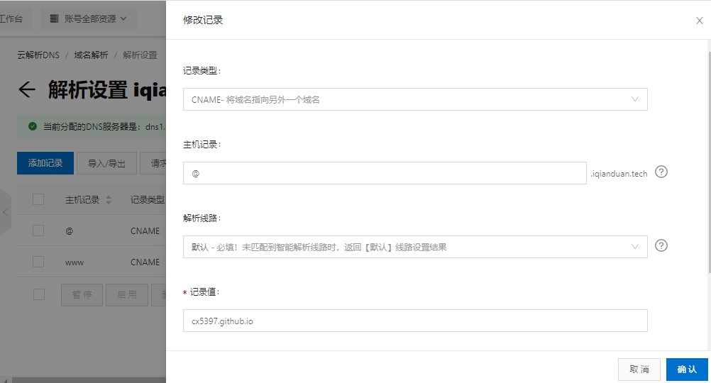 - 在域名服务商将域名 CNAME 到 github 服务器,格式为 github 用户名.github.io(@记录为不带 www 的域名解析)